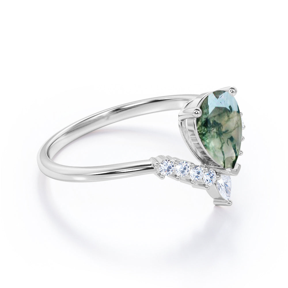 Surprise the queen of your heart with this art deco V-shaped 1.15 carat tear drop shaped Moss Agate and diamond tiara inspired promise ring in Black gold. If you are looking for a classy yet traditional gift for your partner, this vintage crown engagement ring can definitely be the perfect option for you. Exhibiting a solid 1 carat Pear shaped Moss green Agate in the center of the engagement ring which is enhanced with pave diamonds on the crown as the sparkling accents. If you are a vintage bride who is looking for the perfect mid-century modern ring for your engagement this art nouveau engagement ring will the perfect option for you. Moreover, the V-shaped rings, also known as the wishbone rings, are symbolized by luck and love. This vintage beauty perfectly blends with the black gold, giving it an edgy look, but if you are not into black metal colors, it can also be customized in rose gold or white gold, as per your preference. Get ready to impress your loved one with this perfect engagement ring that is available at such an affordable and reasonable price.