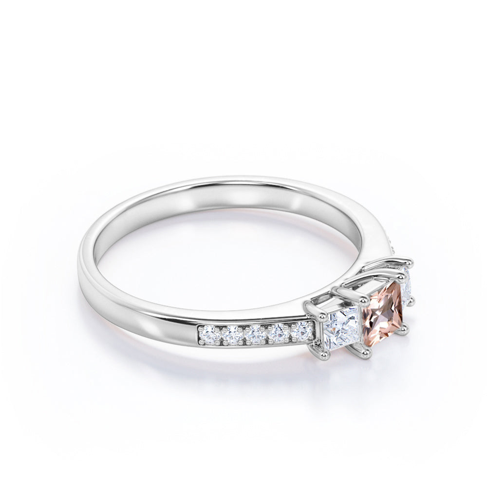 Channel set 0.75 carat Princess cut Morganite and diamond past present future engagement ring in White gold