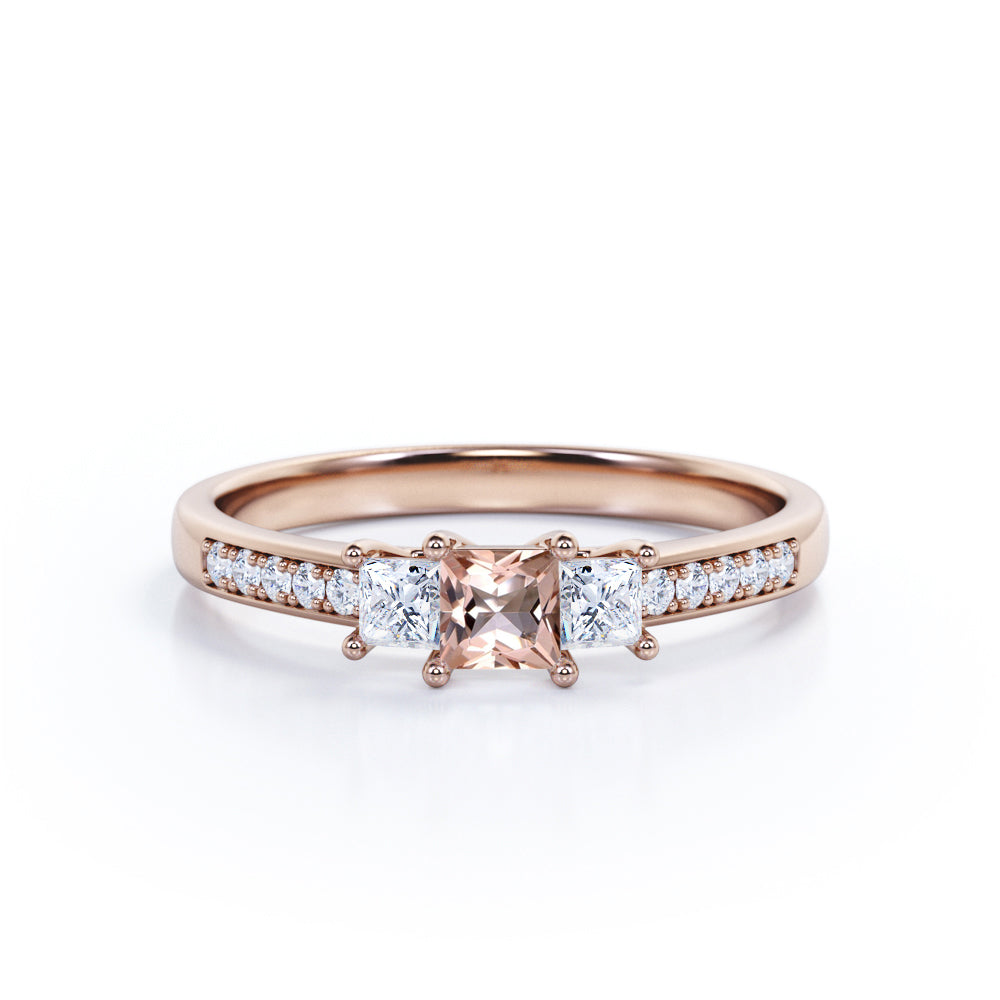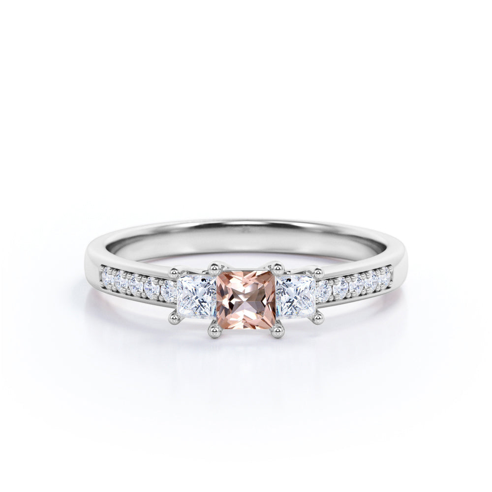 Make your proposal day the most memorable day with this channel set 0.75 carat Princess cut Morganite and diamond past present future engagement ring in White gold. Crafted with our experts in lapidary, this unique three stone engagement ring exhibits a solid 0.5 carat Princess cut Morganite as the center gemstone and is complemented with sparkling diamonds as the side stones. If you are looking for affordable engagement rings, this triple-stone engagement ring could be a great option for you. Don't miss out on this wonderful opportunity, to surprise your beloved with this beautiful vintage style engagement ring. Also, this morganite and diamond engagement ring can be customized either in Rose Gold, Yellow Gold, or White Gold and also in 10k, 14k pure gold or 18k gold plating over silver as per your preference.