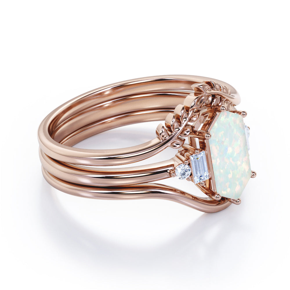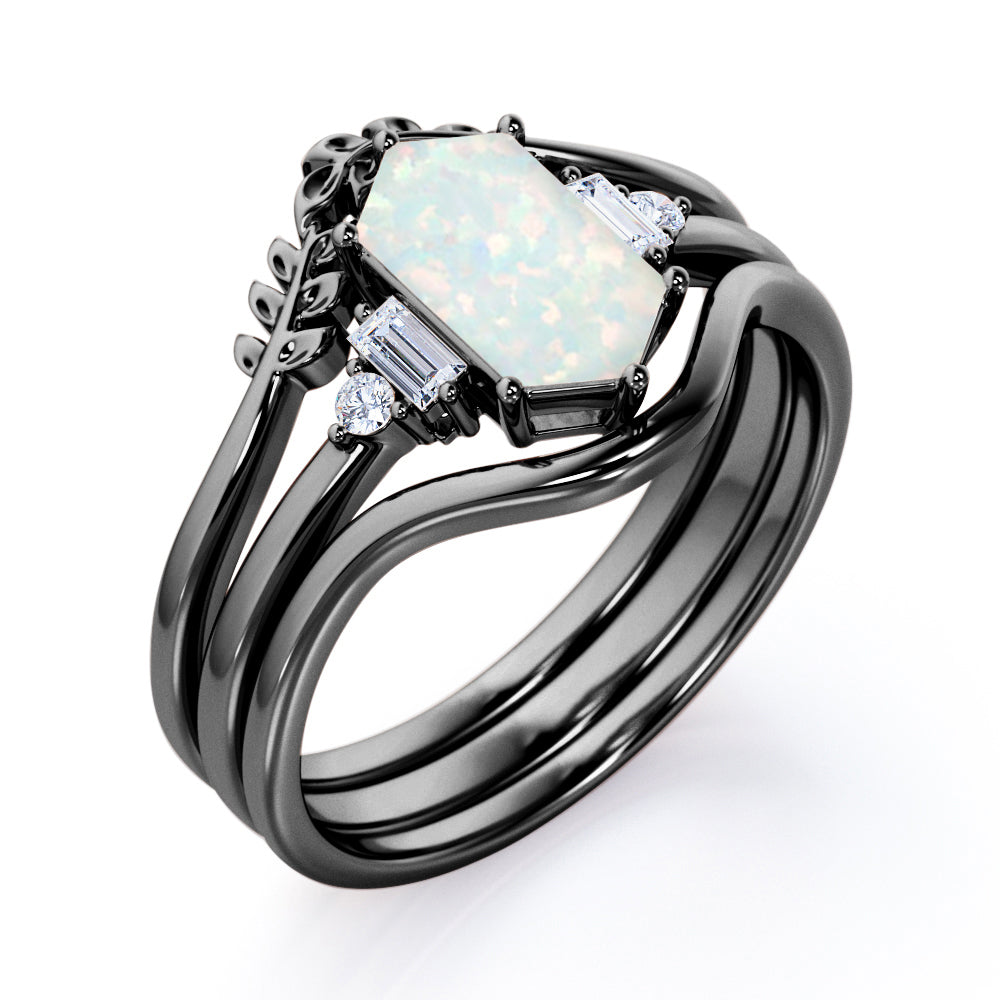 Be mesmerized with this chevron 1.25 carat Hexagon shaped Boulder Opal and diamond dainty leaf trio wedding set in Black gold. This trio wedding ring set features a solid hexagonal shaped Opal and paired with 2 contoured wedding band. The chevron wedding band on top of the engagement ring has a beautiful leaf scrollwork pattern on it, and it is perfect ring for your vintage-themed wedding. The Opal gemstone sits on a 6 prong setting and it is accentuated with round and emerald cut diamonds. For its peculiar design and sparkle, this Opal and diamond wedding set is perfect for those who would like to express their love in a charismatic way. Unique and exclusive, this nature inspired wedding set can be customized in 18k Rose gold over silver, 18k Black gold over silver, 18k White gold over silver, 10k Rose Gold, 10K Black Gold, 10k White gold, 14k White gold, 14k Rose Gold or 14k Yellow Gold upon customer request at an affordable price.