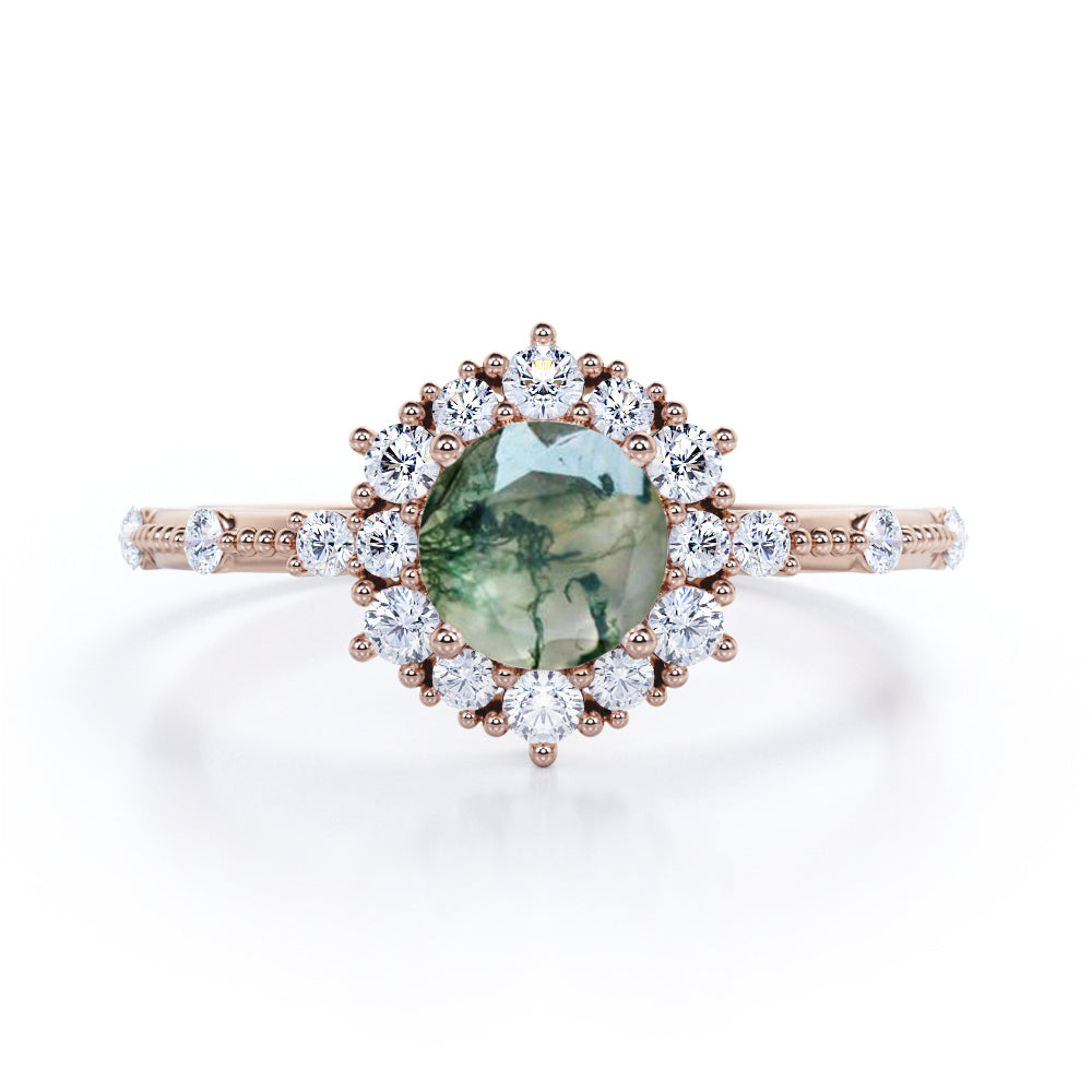 Engraved Vintage 1.25 carat Round cut Moss Green Agate and diamond Edwardian art deco engagement ring in Rose gold. This engagement ring displays a natural round cut Moss Green Agate stone in the center and is accentuated with diamonds on the side as the sparkling stones. If you are looking for a unique birthday gift for friends, girlfriend, or any one you love, please let our beauteous anniversary rings help you out. Undoubtedly, whoever receiving this dainty jewelry would be very impressed. Also, this cluster engagement ring is a bold and statement piece of jewelry that is available in silver and gold in white gold, black gold or rose gold according to your style and preference. Get ready to surprise your loved one with this affordable and handcrafted engagement ring and cherish your special moment for a lifetime.