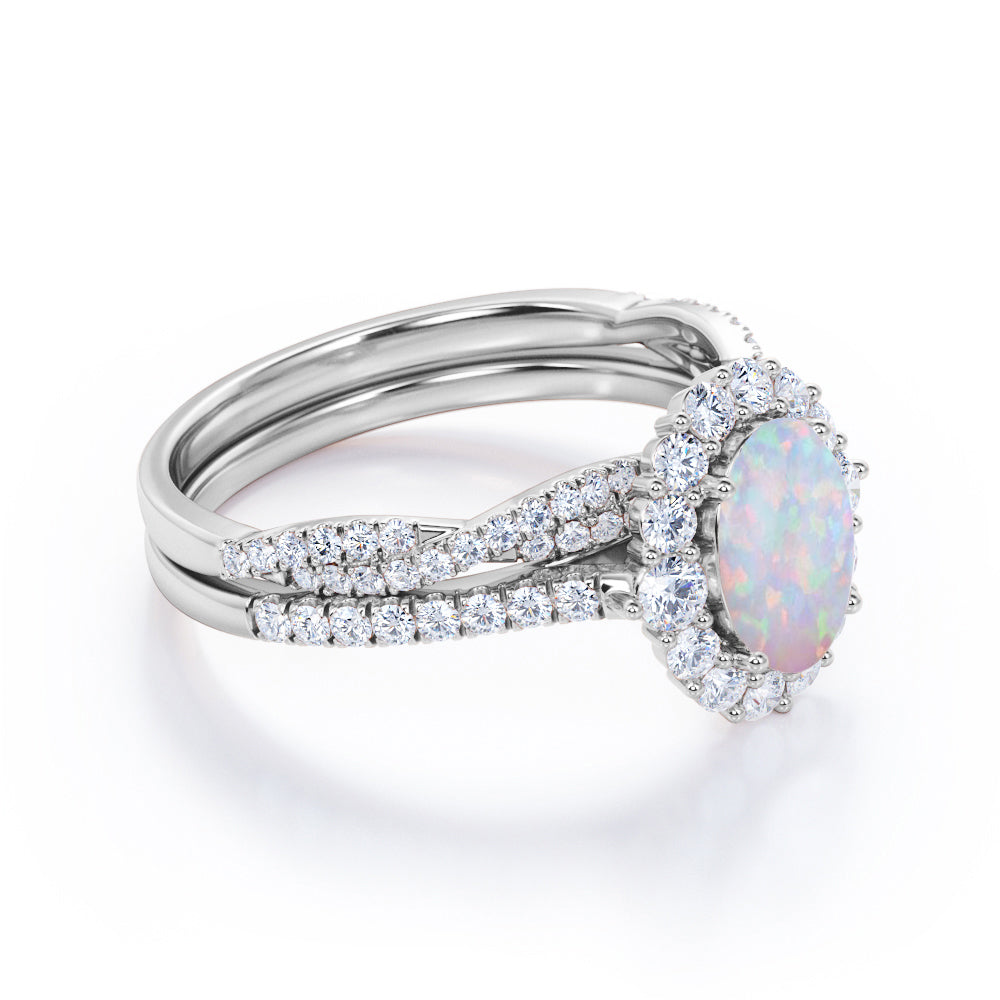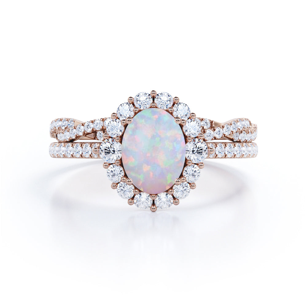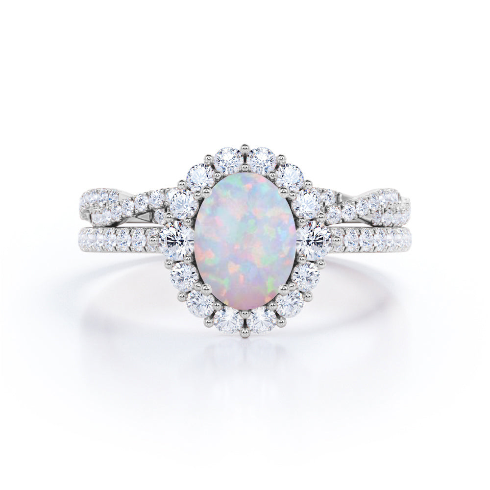 Be highly fashionable with this Infinity 1.75 carat Flower-shaped Ethiopian Opal and diamond Wedding ring set for her in White gold. This flower cluster ring showcases a Oval cut Ethiopian Opal and is paired with a half infinity diamond wedding band. Skillfully hand cut by our fine jewelers, this vintage floral engagement ring set can be customized either in 18k Rose gold over silver, 18k Yellow gold over silver, 18k White gold over silver, 10k Rose Gold, 10K Yellow Gold, 14k Rose Gold or 14k Yellow Gold upon customer request. Furthermore, the The 10k and 14k gold metal options will be made with diamond side stones whereas the Silver metal options will be made with moissanite side stones. If you are looking for some floral inspired engagement rings then this opal and diamond cluster ring set is the perfect design for you. Do not miss this amazing opportunity to get this opal and diamond wedding ring set at such affordable and reasonable price. All the orders come with 30 days full refund policy and 30 days free resizing, starting from the day the order is delivered to you.