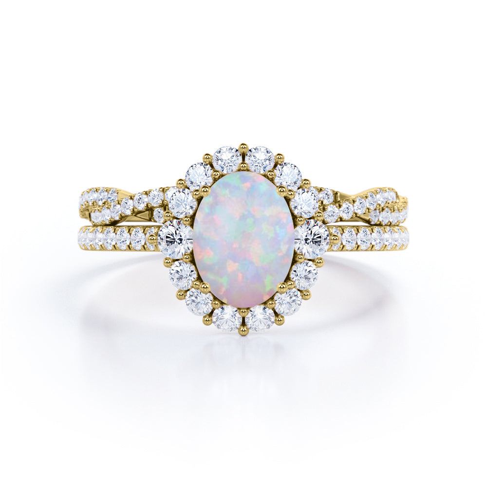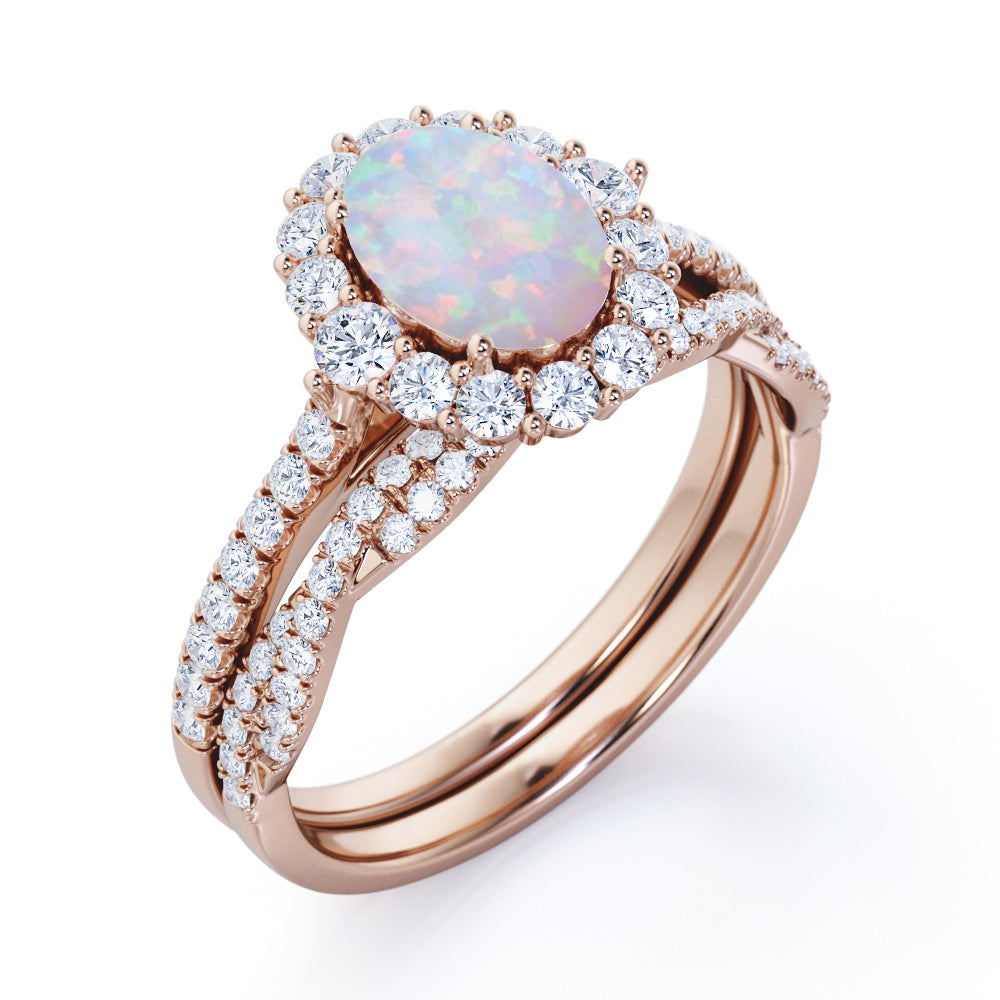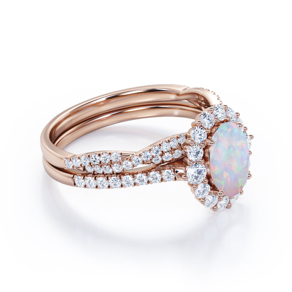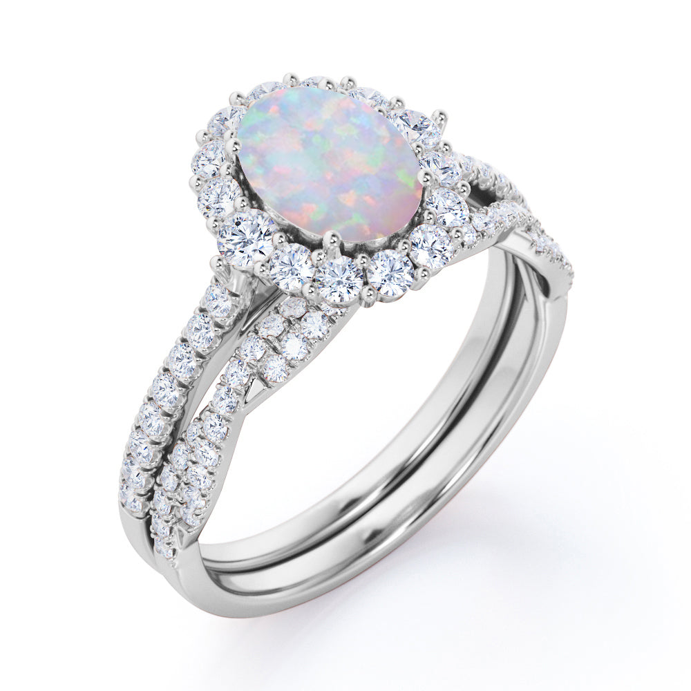Be highly fashionable with this Infinity 1.75 carat Flower-shaped Ethiopian Opal and diamond Wedding ring set for her in White gold. This flower cluster ring showcases a Oval cut Ethiopian Opal and is paired with a half infinity diamond wedding band. Skillfully hand cut by our fine jewelers, this vintage floral engagement ring set can be customized either in 18k Rose gold over silver, 18k Yellow gold over silver, 18k White gold over silver, 10k Rose Gold, 10K Yellow Gold, 14k Rose Gold or 14k Yellow Gold upon customer request. Furthermore, the The 10k and 14k gold metal options will be made with diamond side stones whereas the Silver metal options will be made with moissanite side stones. If you are looking for some floral inspired engagement rings then this opal and diamond cluster ring set is the perfect design for you. Do not miss this amazing opportunity to get this opal and diamond wedding ring set at such affordable and reasonable price. All the orders come with 30 days full refund policy and 30 days free resizing, starting from the day the order is delivered to you.