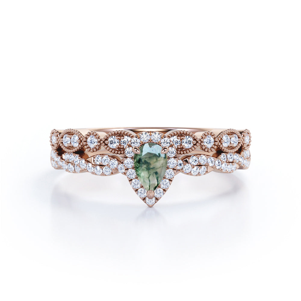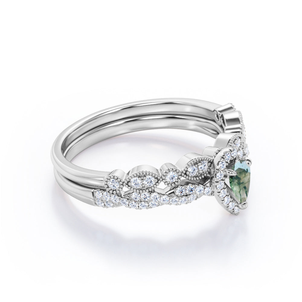 Infinity Halo 1.1 carat Pear cut Moss Green Agate and diamond bridal set for her in White gold. With our lapidary's years of experience, this gemstone bridal ring is beautifully crafted with a solid Pear cut Moss Green Agate gemstone as the center gemstone and is enhanced with pave diamonds on the side as the sparkling side stones. The twisted engagement ring features a glimmering Moss Agate stone in a halo setting which is a solid semi-precious gemstone which can last you for a lifetime. Moss Agate gemstone are known to encourage a sense of tranquility and emotional balance of the wearer. So, if you are looking for some unique gifts for your partner, this natural gemstone engagement ring could be the perfect option for you. The infinity engagement ring is perfectly paired with a milgrain marquise and dot wedding band, and it perfectly enhances the vintage nature of the bridal set. Also, this infinity halo wedding ring is available at a reasonable price and can be customized in silver or gold in three metal colors like white gold, yellow gold or rose gold as per your request.
