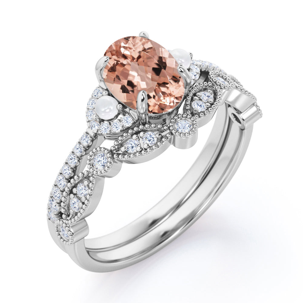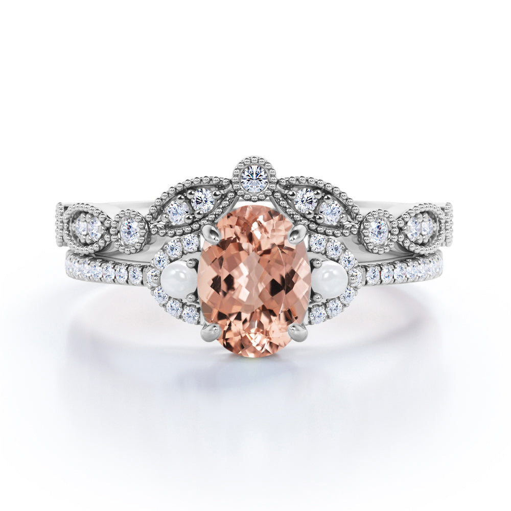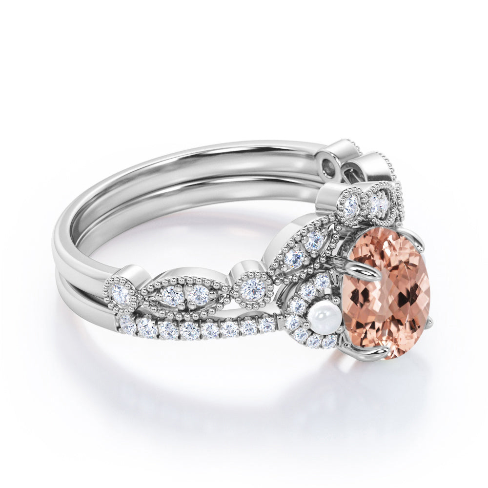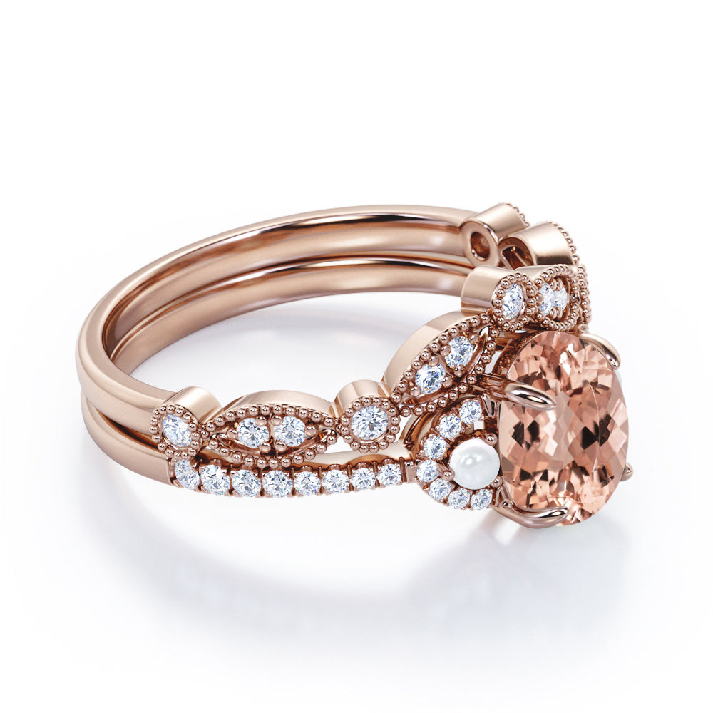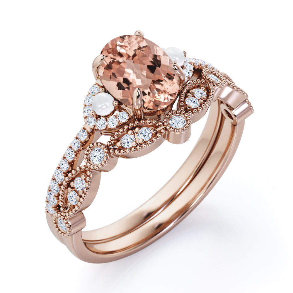 Milgrain Décor 1.75 carat Oval Shaped Morganite and diamond antique art deco wedding ring set in Rose gold