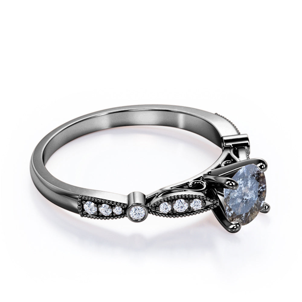 Royal Cathedral setting 0.75 carat Round cut Salt and pepper diamond and White diamond vintage engagement ring in Black gold