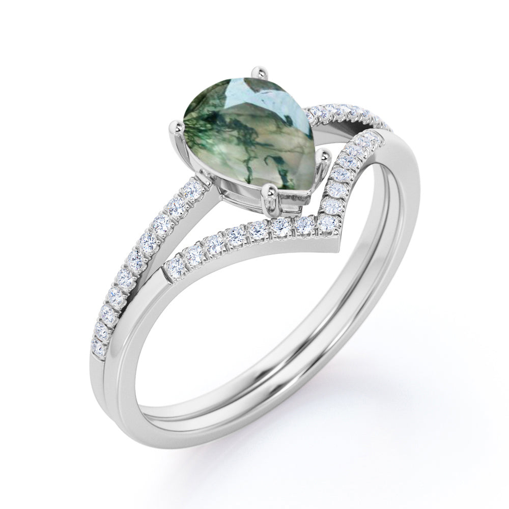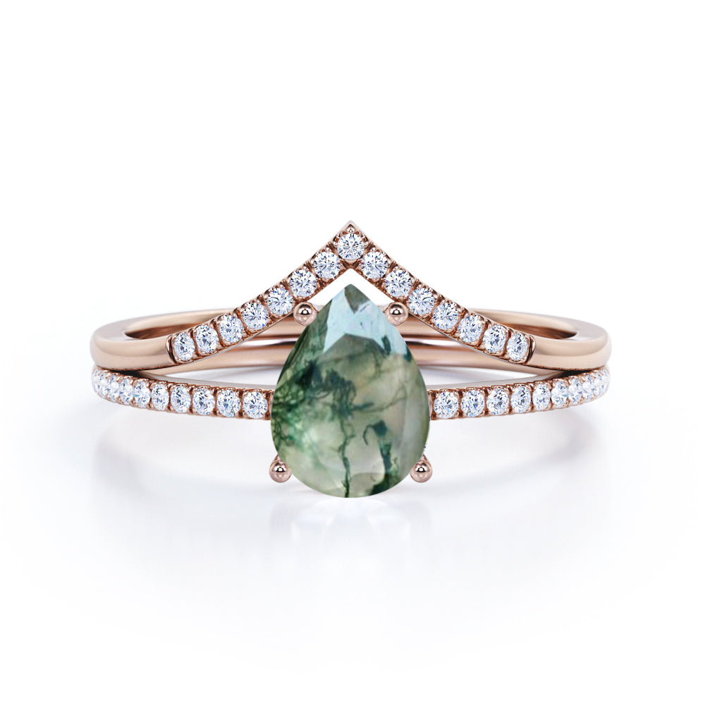 Exude your elegance with this stylish contoured 1.35 carat Tear drop shaped Moss Agate and diamond chevron crown Bridal set for women in Black gold. Meticulously handcrafted by our passionate artisans, this art deco wedding ring displays a solid pear shaped Moss Agate gemstone and is enhanced with pave diamonds on the engagement ring and wedding band as the sparkling stones. Known as the April birthstone, this Moss Agate ring will be a perfect gift to all the April born. Not only as a milestone ring, but this chevron wedding ring can be paired and styled to any occasion and it will absolutely complement the beauty of its wearer. This exclusive artisan engagement ring is available in 18k Rose gold over silver, 18k Black gold over silver, 18k White gold over silver, 10k Rose Gold, 10K Black Gold, 14k Rose Gold or 14k Black Gold upon customer request.