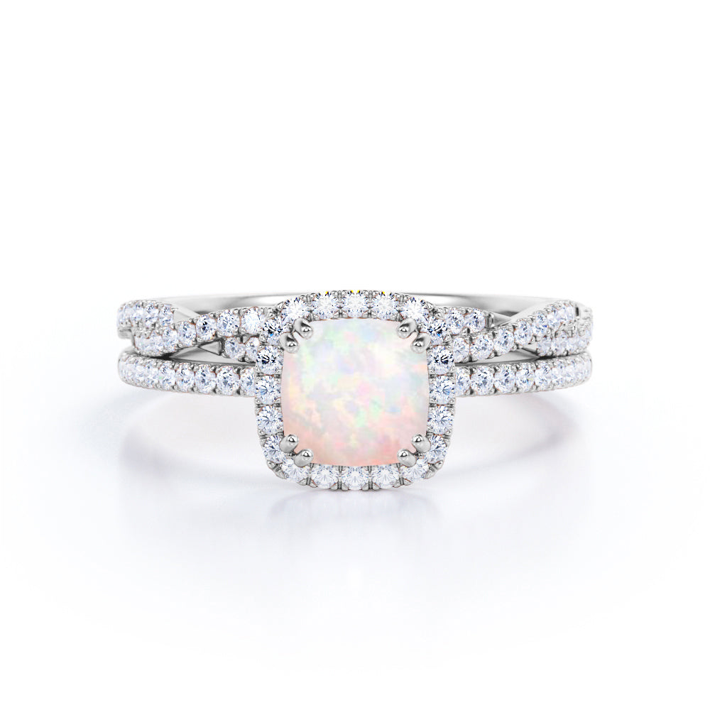 Vintage 1.6 carat Cushion cut Fire Opal and diamond Twisted infinity Wedding ring set in White gold