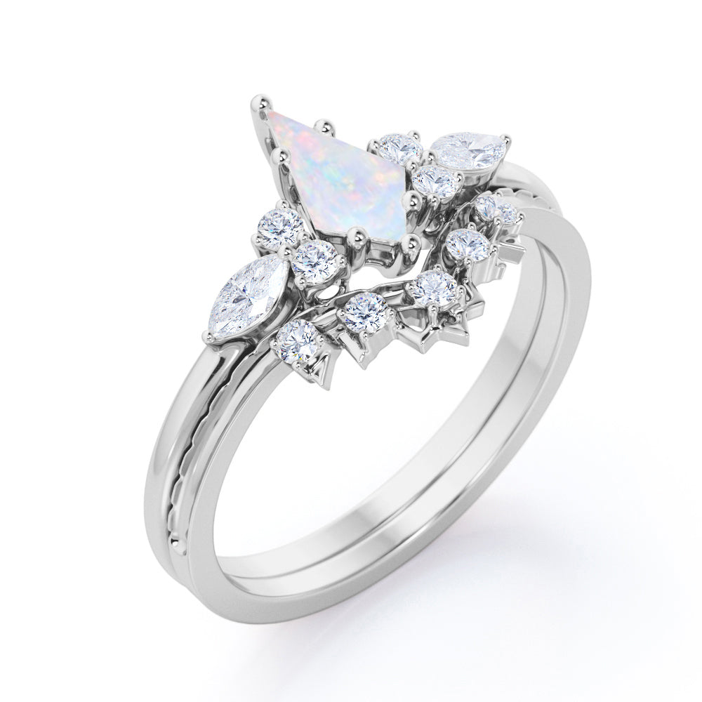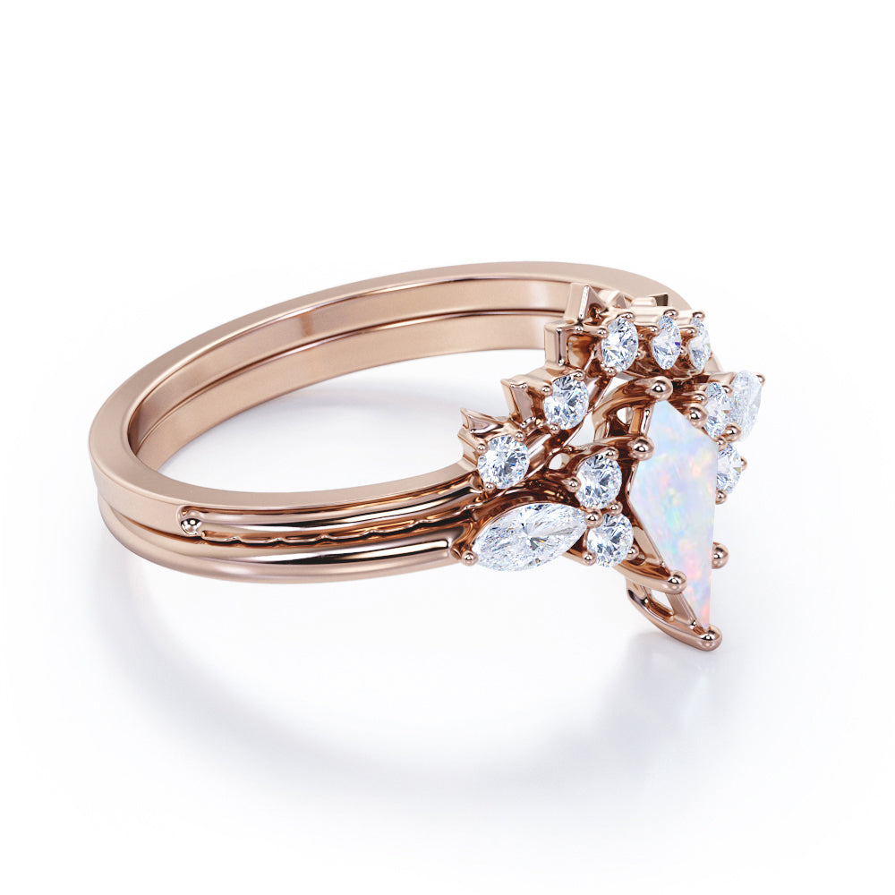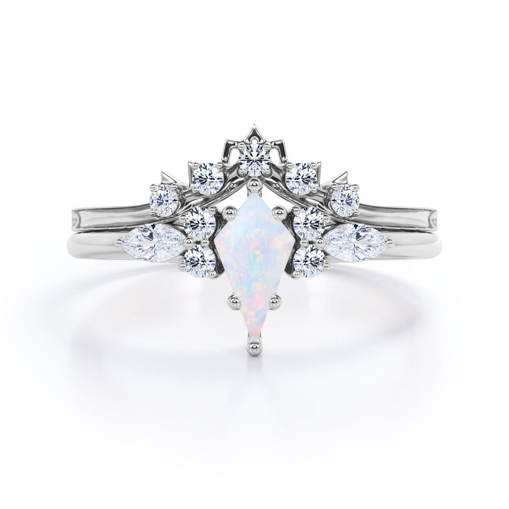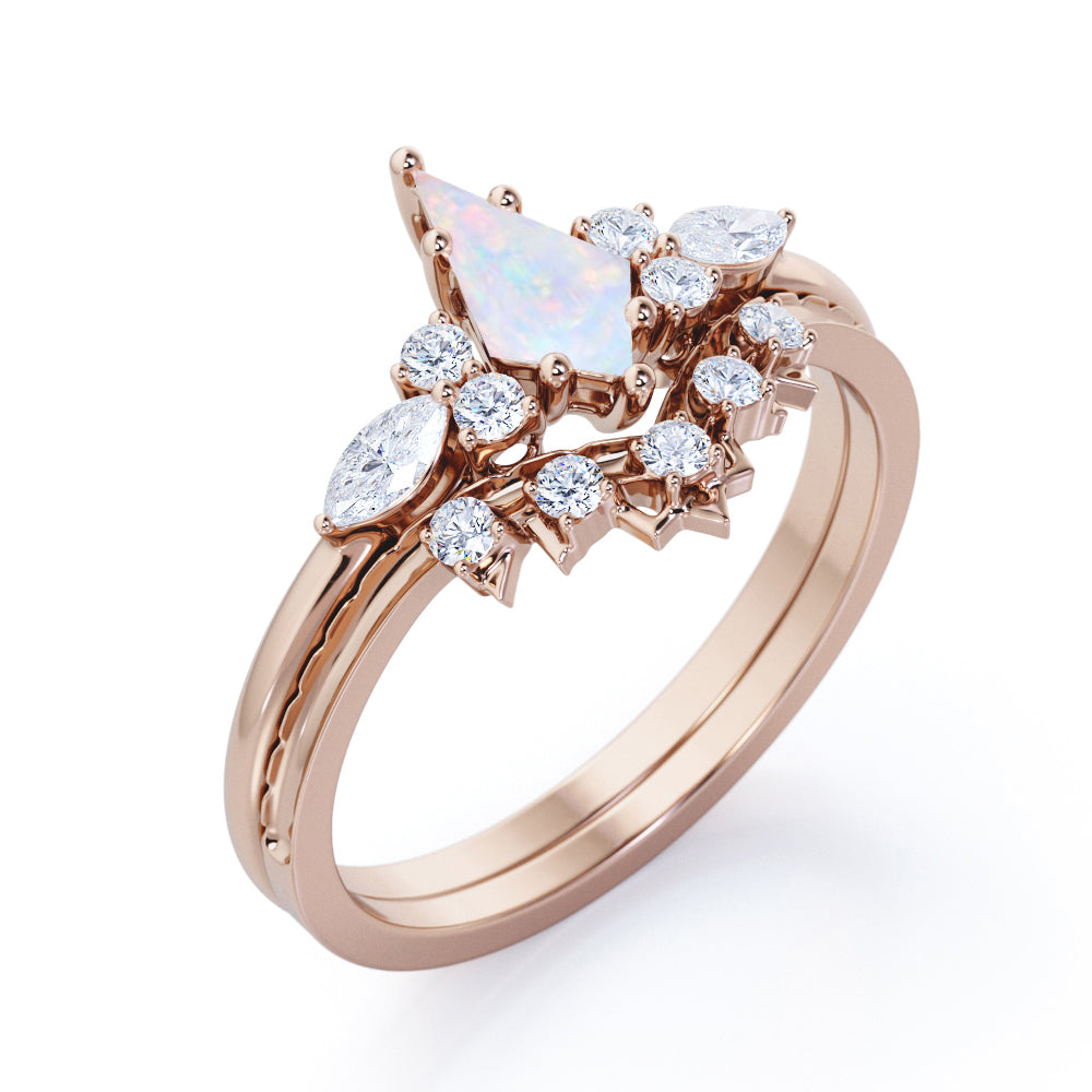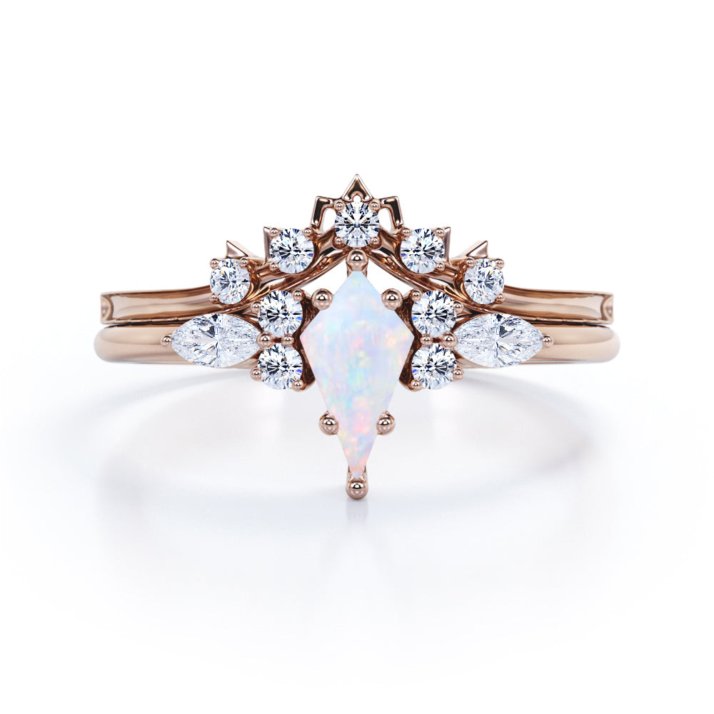 Embellish her finger with this vintage chevron crown 1.15 carat Kite Shaped Australian Opal and diamond art deco engagement ring in Rose gold. Handmade with sporting craftsmanship, this royal wedding ring showcases a Kite shaped Natural Opal and complemented with round and marquise diamonds as the sparkling side stones. The contoured wedding band has 5 pave diamonds set with a tri-crown design at the top the band giving it a instant vintage royal look. Making it unique and exclusive, this 6 prong wedding ring can be customized to your choice of metal colors like 10k or 14k Rose Gold, 10k or 14k Yellow Gold, 10k or 14k White Gold, 18k Silver over White gold, 18k Silver over Rose gold and 18k Silver over Yellow gold as per customer request. Handmade and customized to perfection, this vintage royal engagement rings set is available at such an affordable and reasonable price.