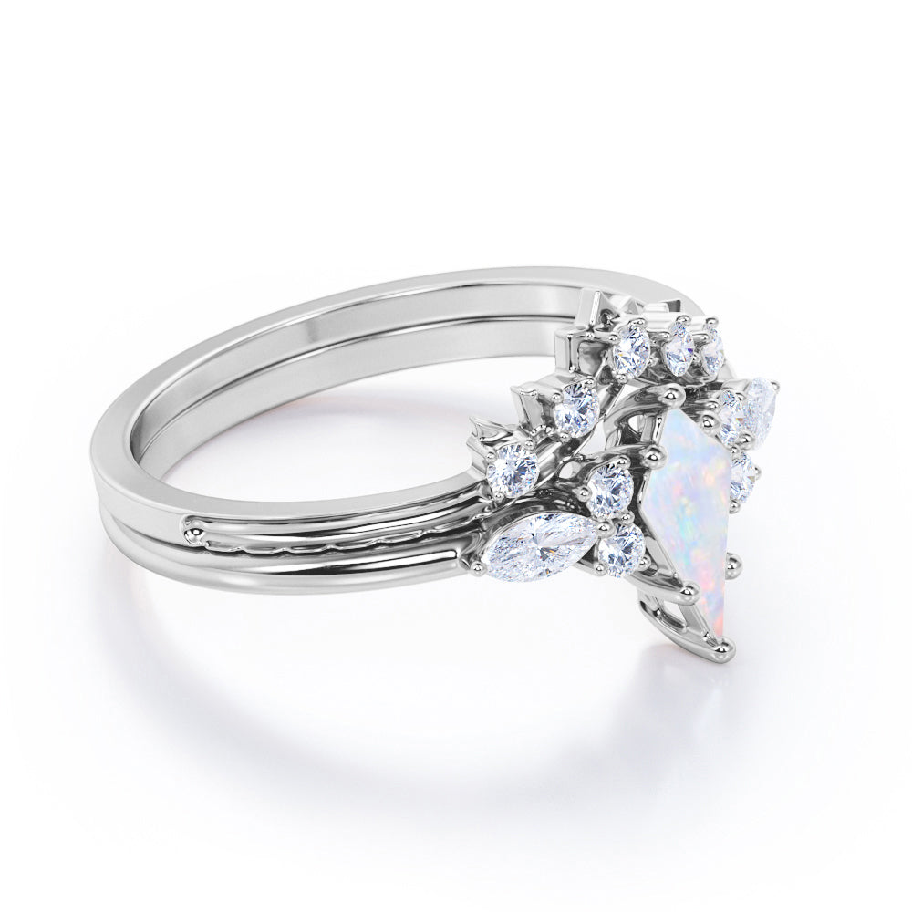Please be informed that the opal and diamond Bridal set will be made with moissanite accent stones for 18k silver over gold metal option and diamond accent stones for 10k and 14k gold metal option. Moreover, the ring comes with a 30-day full refund policy and one free resizing within 30 days upon receipt of the item.